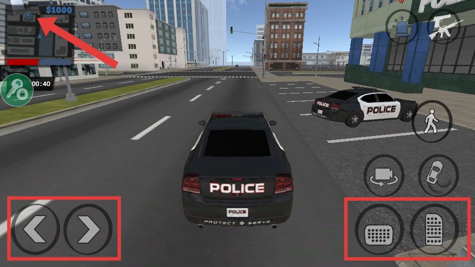 驾驶警车时,通过左侧的【方向键】来操控转向,右侧的【油门】和【刹车】用于控制车辆速度,同时按照小地图的指引前往指定的任务地点。