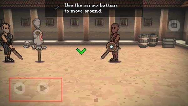 接下来要进行的是新手引导,第一步是通过左侧的左右按钮操控角色移动,当玩家抵达绿色指示箭头所在位置时,就会开启下一步操作。