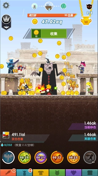 一款需要手动点击的挂机游戏,通关全凭运气。最后提一句,佣兵在挂机时的伤害根本没什么作用。
