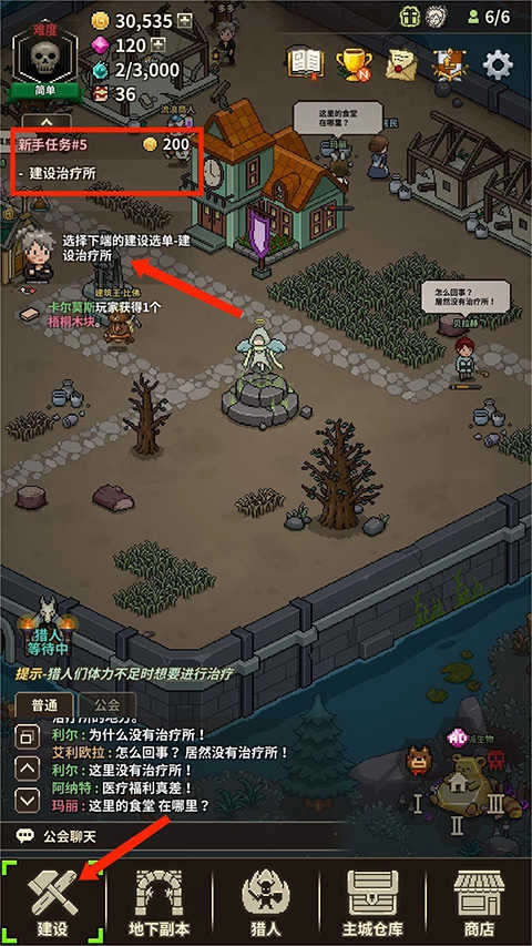 2、点击【小人物】图标,就能看到任务要求;接着打开建设选单,选择并建设治疗所。