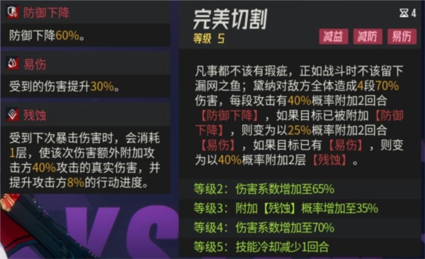 黛纳的三技能堪称“加伤全家桶”,能一次性叠加破甲、增伤、提升受暴击伤害这三种效果,妥妥的debuff达人。虽说她基础命中不算高,但我们可以给她搭配三件效果命中装备——毕竟效果命中属性很好堆叠。前期体力如果有剩余,刷疾驰副本(速度套装)就够用了,毕竟速度套是最百搭的套装,资源浪费相对较少,只要确保她能在主力输出之前出手就行。前中期大部分战斗基本2-3回合就能结束,完全不用在意三技能长达5回合的冷却时间(图里是因为技能拉满了,所以冷却减了一回合)。