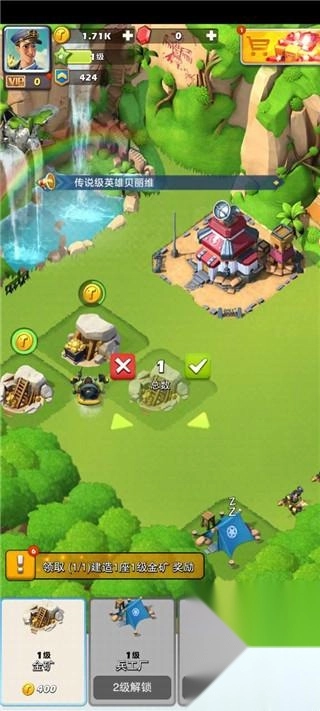 7、点击建造按钮,修建若干个金矿,建筑还能通过拖拽合并的方式进行升级;