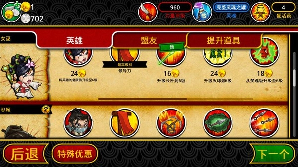 3、持续为你的武士英雄进行升级,借助获取更高级别的武器、防御装备以及魔法技能,逐步蜕变为游戏里更具实力的角色。