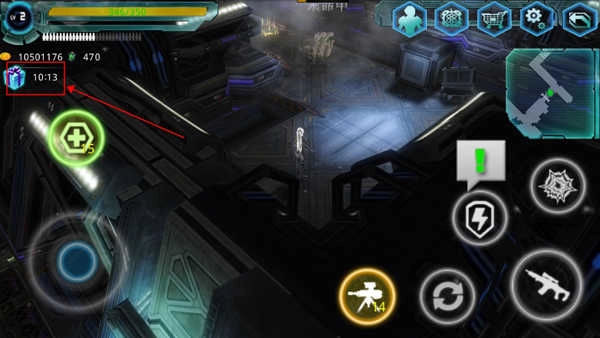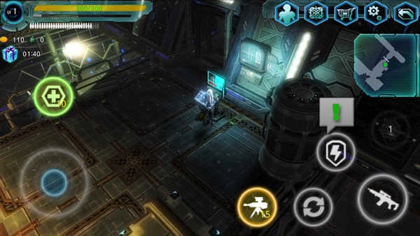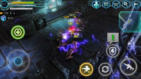款游戏的操作不是很难,进入游戏后玩家可以看到界面左下角有个圆环按钮,这个按钮是用来控制角色移动的,玩家想让角色往哪个方向移动就按住该按钮向哪个方向移动即可。玩家在移动的过程中要根据地面上绿色箭头的指示来,如果遇到异形生物的时候,玩家点击界面右下角带枪图标的按钮就可以发射子弹攻击目标,此外游戏中还提供了一个道具,那就是有黄色图标的机枪标志,当玩家点击该图标,就可以使用释放机枪塔自动攻击。