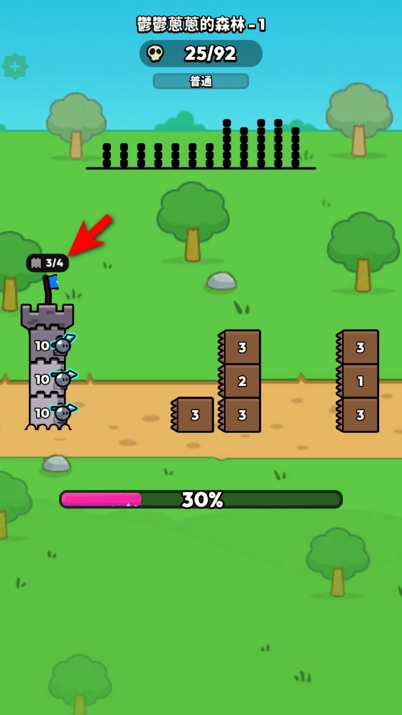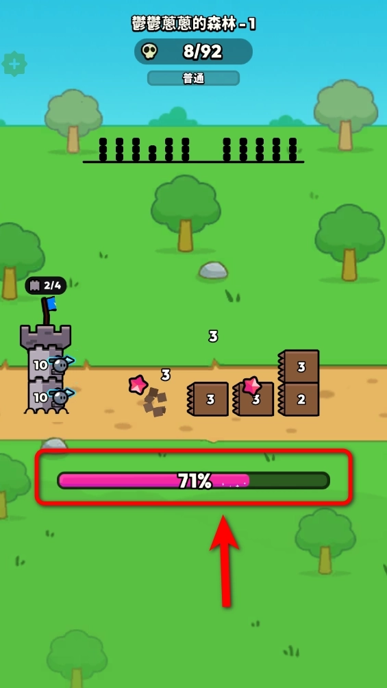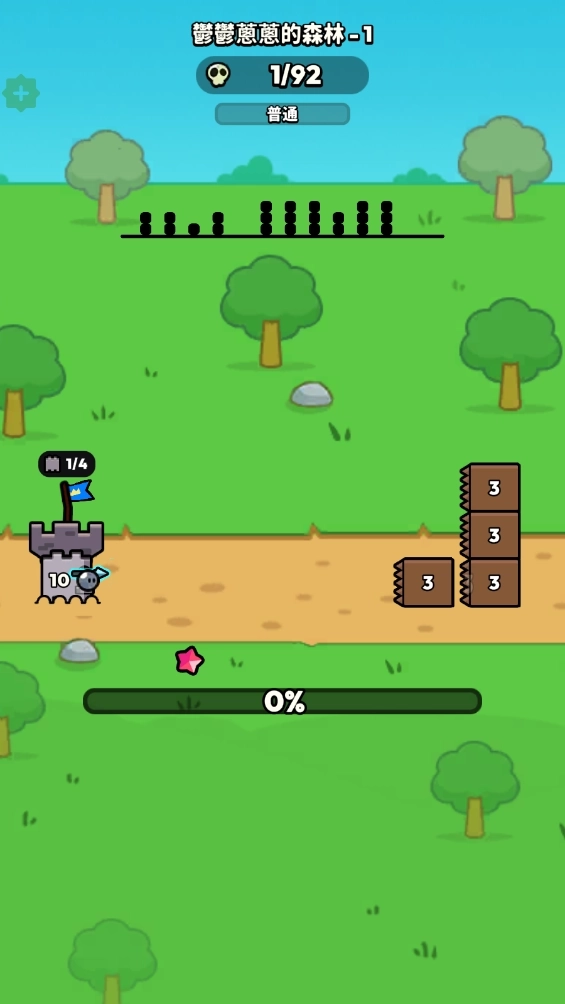 3.左侧是你的防御塔,右侧为敌人所在位置,你的防御塔会对持续逼近的方块大军发起自动攻击。