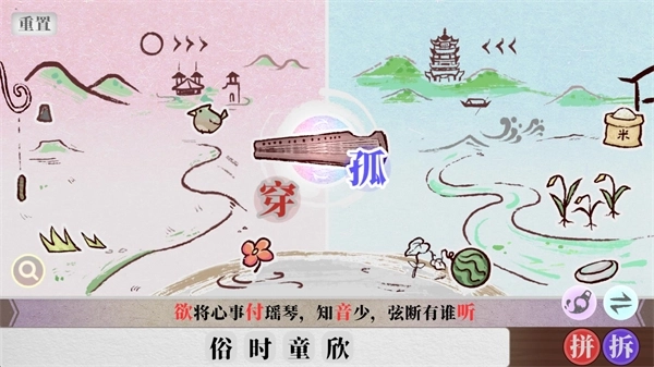 5、点击拆分出的这些汉字,再通过两两拼接的方式组合成诗词里所需的汉字——即带有红色标识的汉字,等诗词中的所有汉字都拼接完成后就能顺利通关。