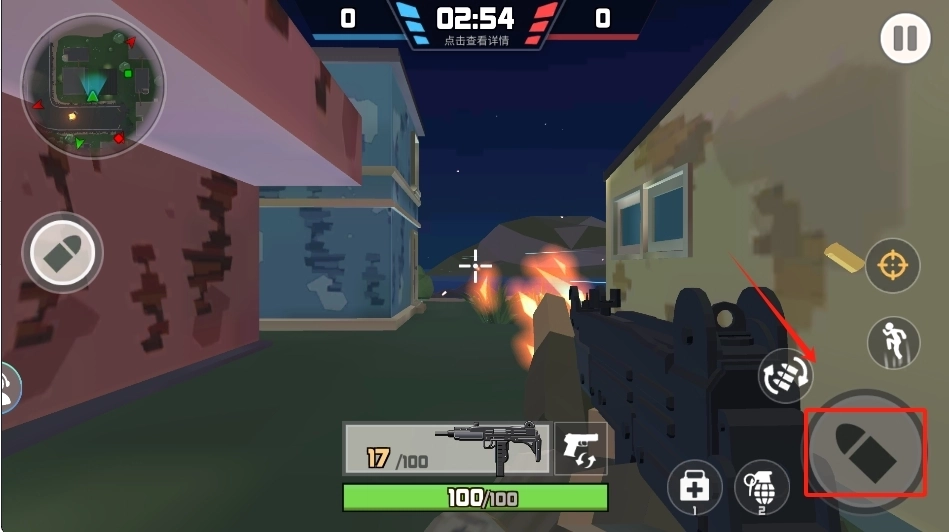 2、用左下角的虚拟摇杆来操控移动,右下角的按键则分别对应射击、换弹和切换武器的功能。