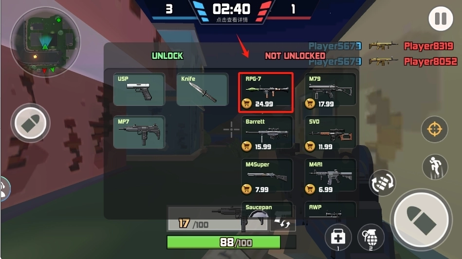 3、积攒游戏内的货币,用来解锁新的武器。到商店里依据价格挑选合适的武器,比如RPG-7,通过合理的搭配来增强战斗力。