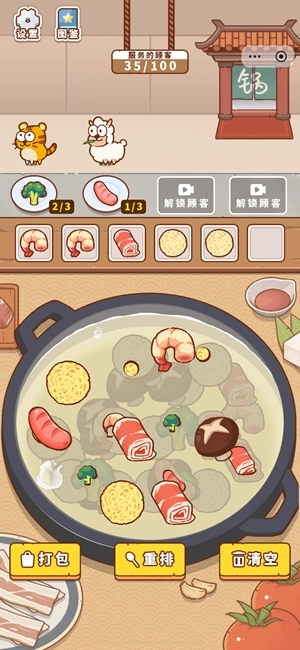 1、玩家需通过点击食材,让三个相同的菜品浮出汤面并供给顾客。