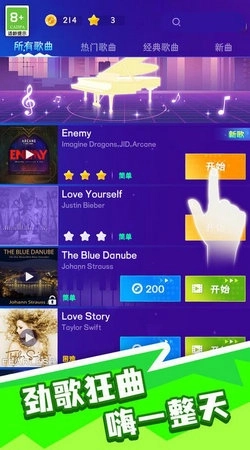 2、看似简单的操作实则充满挑战,不仅收录了丰富多样的歌曲,还配备了炫酷的特效,让玩家在节奏律动中尽情感受音乐的独特魅力。