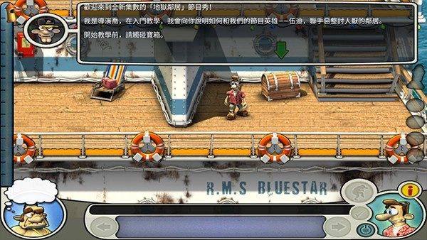 等老头上楼后,先去推倒耙子,接着把水草铺在耙子上;然后将螃蟹放进冰镇桶(就是放啤酒的那个桶);之后立刻回到左边,把鲨鱼翅安装到玩具潜艇上;再前往左上区域,等老头下楼后马上到右上区域,把电鳗倒进池塘,用锯子对栏杆做些手脚,就完成啦~第3关所需物品:尼龙袜(位于右下方的提包内)、辣椒酱(在小食店处获取)、炮弹(右上方区域)、润滑油(右上方区域)、扳手(左上角的工具包中) 操作