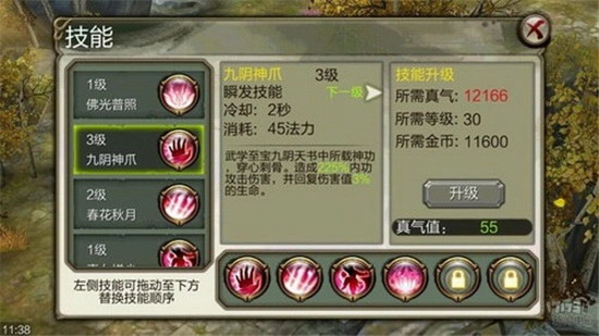 1、九阴神爪:对单个敌人造成较高伤害,同时能为自身恢复生命值。