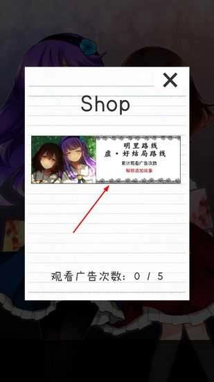 1、付费结局其实就是明理路线,这个路线的问题很好解决,解锁该结局的方法也十分简单,只需观看5个广告就行。具体操作如下:我们在主界面点击【shop】按钮。