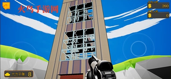 就能快速炸毁整栋楼,用越少的子弹就能得到越高的分数,右上角会显示当前分数和可获取的金币;
