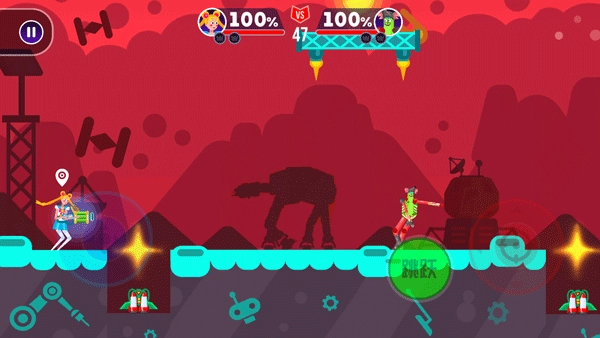 右侧绿色按钮控制角色跳跃,红色摇杆控制角色射击。