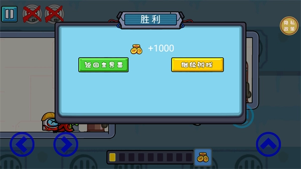 当两个角色都顺利达成各自的目标任务后,这一关卡的挑战便宣告成功,玩家能够获得金币作为奖励,这些金币可用于解锁更多的武器和道具。
