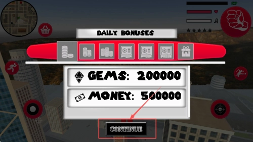 2. 领取奖励:进入游戏之后,点击“DAILY BONUSES”来领取每日奖励,点击“CONTINUE”接着继续游戏。