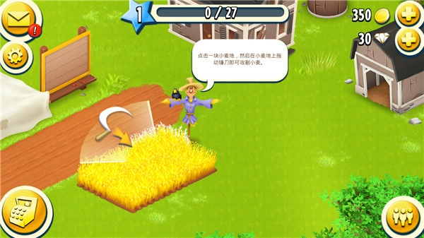 根据指引,先选中麦田作物,再切换到收割工具,接着用工具划过所有待收的作物区域完成操作。