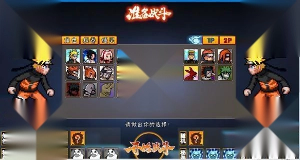 3、选择【单人对战】后来到角色选择界面:1P是1号玩家,使用大键盘操作;2P是2号玩家,使用小键盘操作