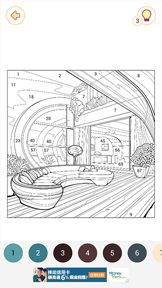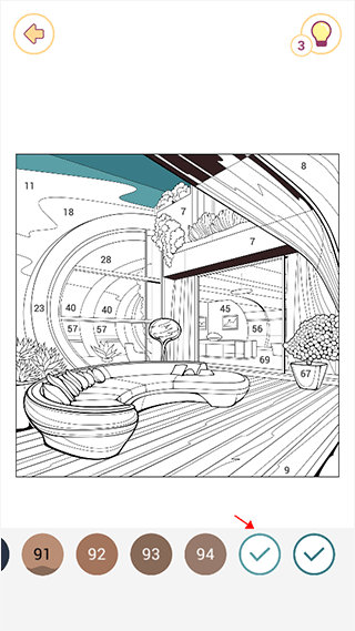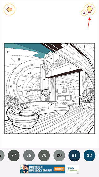 4.如果实在找不到未填完的色块,除了把图形放大进行寻找之外,还可以点击右上角的灯泡图标,进行提示