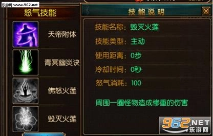 毁灭火莲(主动技能):作为佛怒火莲的进阶版本,每次释放能对周身范围内的怪物造成相较于佛怒火莲更剧烈的伤害,每次使用需消耗100点怒气值,且没有冷却时间。