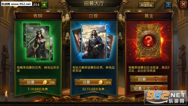 青铜招募单次需花费200金币,每8小时可免费招募一次;白银招募单次消耗1000金币,免费招募的冷却时间为24小时。这两个档次的招募结果通常是绿色、蓝色英雄,或是英雄经验等道具,不过理论上白银招募获得蓝色英雄的概率会略高一些。
