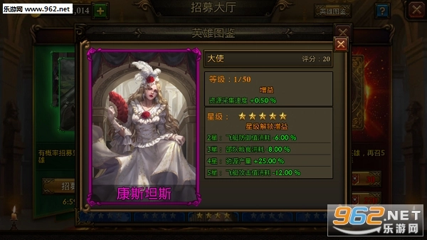 点击英雄即可查看其名称、立绘、增益、评分,以及星级提升解锁的增益效果。绿字标注的增益数值为英雄1级时的初始数值,提升英雄等级后增益会显著增加!真好奇小编一直惦记的康斯坦斯小姐姐何时才会加入我的队伍呢……