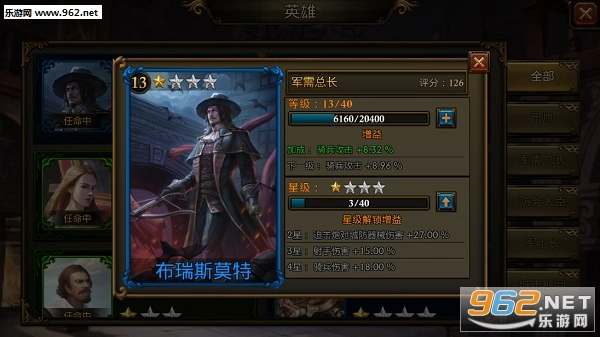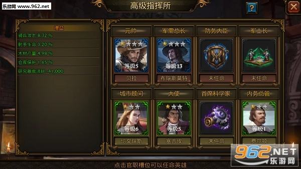 第三个功能高级指挥所是查看英雄整体增益和任命英雄的场所。英雄只有被任命后,其增益效果才会生效,在左侧能看到当前已任命英雄带来的所有增益效果。