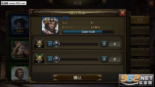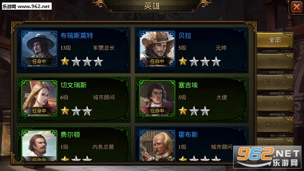 从这个界面能发现英雄是有类型划分的,依据智能可分为元帅、军需总长、防务大臣、军士长、城市顾问、大师、首席科学家、内务总管。英雄的增益效果和他们的职位存在关联,像城市顾问主要提高资源的产粮与采集速度,元帅能让你的士兵更易存活,军需总长会使你的士兵变得更威猛。至于每个英雄的具体增益,各位领主可以进入游戏逐个查看了解~