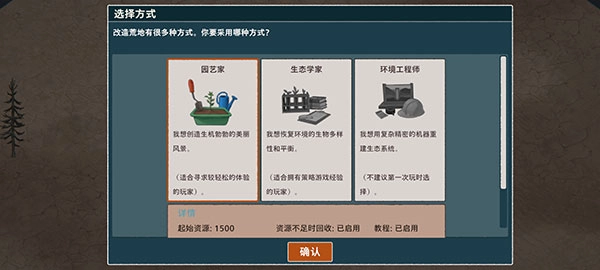 进入伊始之地手机版最新版本后,首先会播放一段动画,之后你能够选择园艺家、生态学家和环境工程师这三种玩法模式。