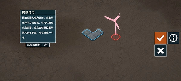 现在,我们正式启动建造流程。第一步先放置一台风车,以此获取电力。操作时请拖动选择具体的放置位置,需要注意的是,红色区域代表不可选的区域。