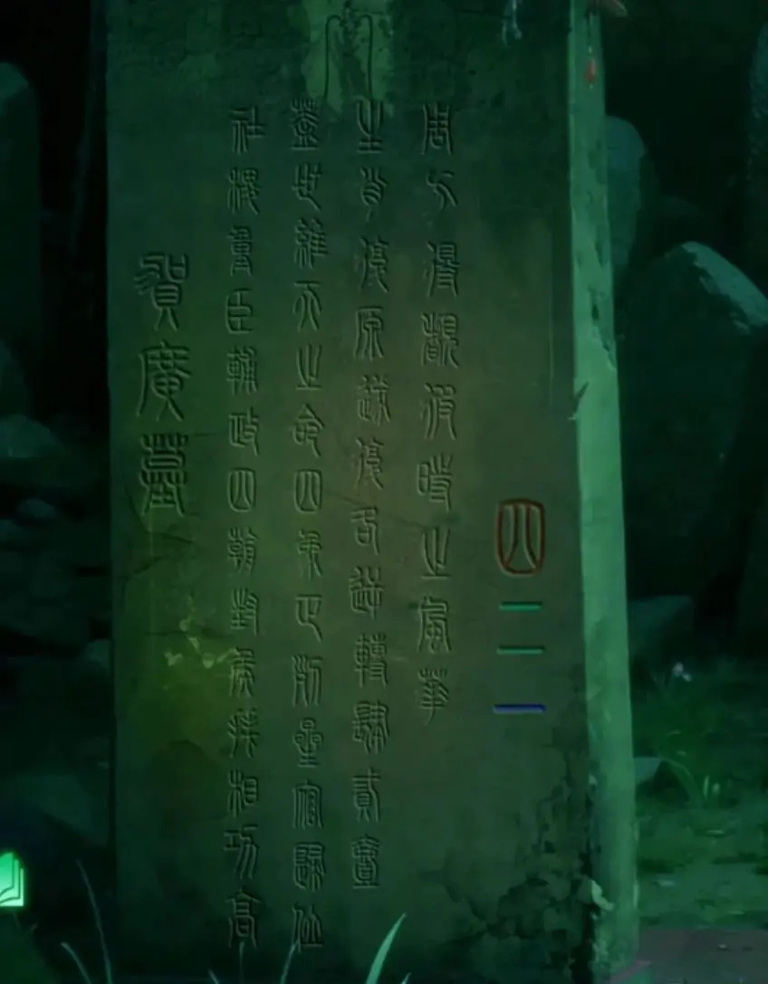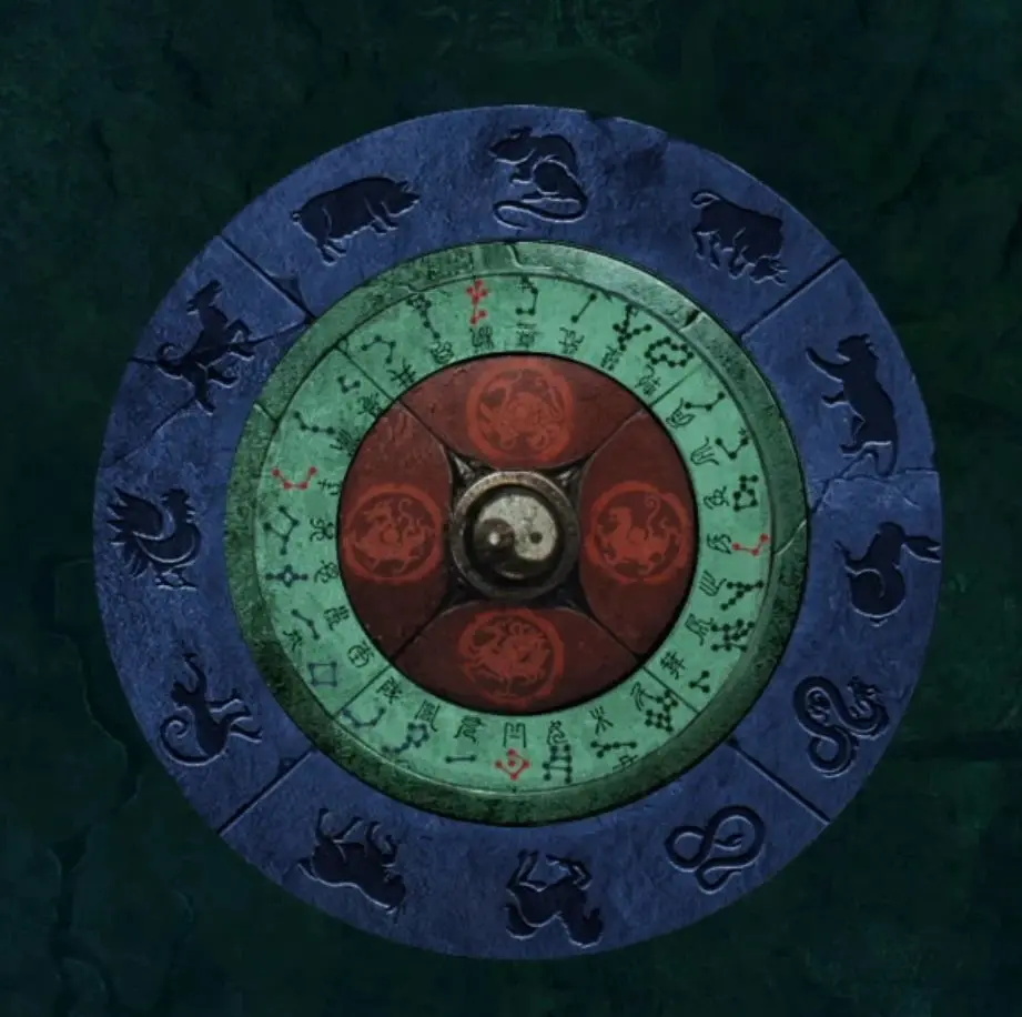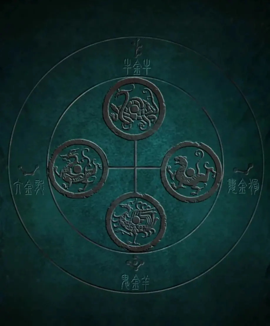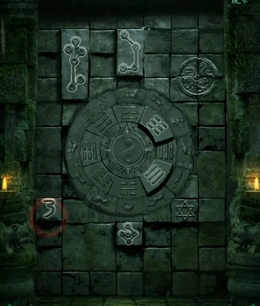 点击右上角雕像的头顶处,能发现一个线索,关键在于那些形似树枝的鬼画符位置,大乌龟玄武也在那上面。由于这是个圆盘,只需记住上方的内容就行。最外圈的鬼画符虽然不认识,但能辨认出下面是羊的图案,把这个记下来。