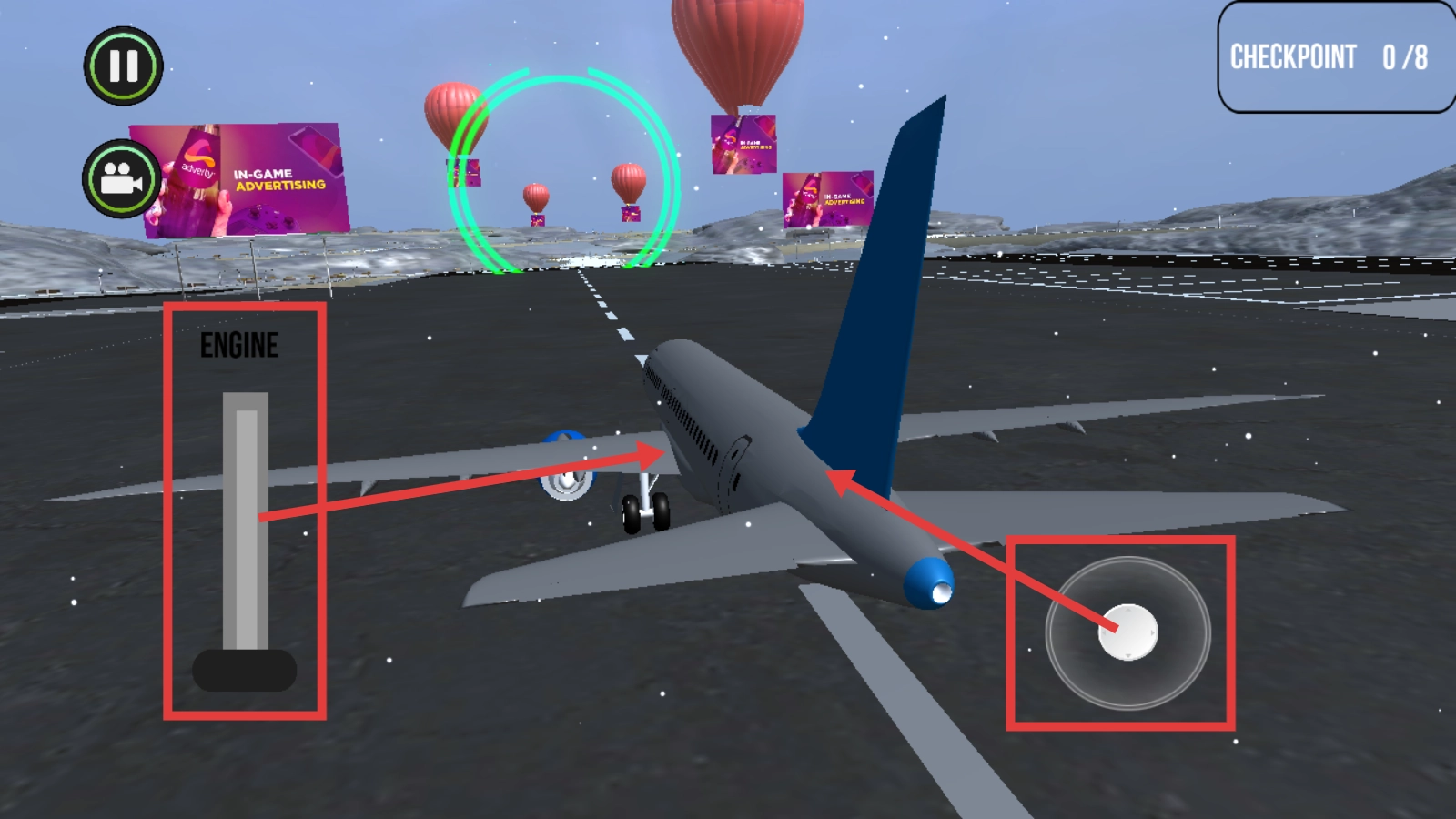 驾驶飞机时需留意【ENGINE】状态,借助操控按钮操控飞机行进,开启关卡推进流程。