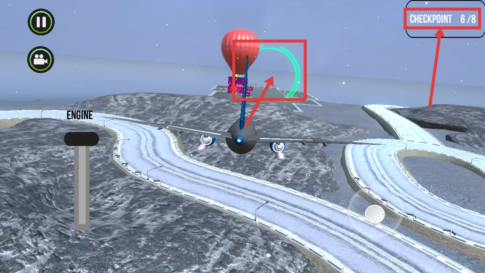 飞行途中穿过绿色圆环检查点,注意查看【CHECKPOINT-6/8】的进度,一步步完成所有检查点。