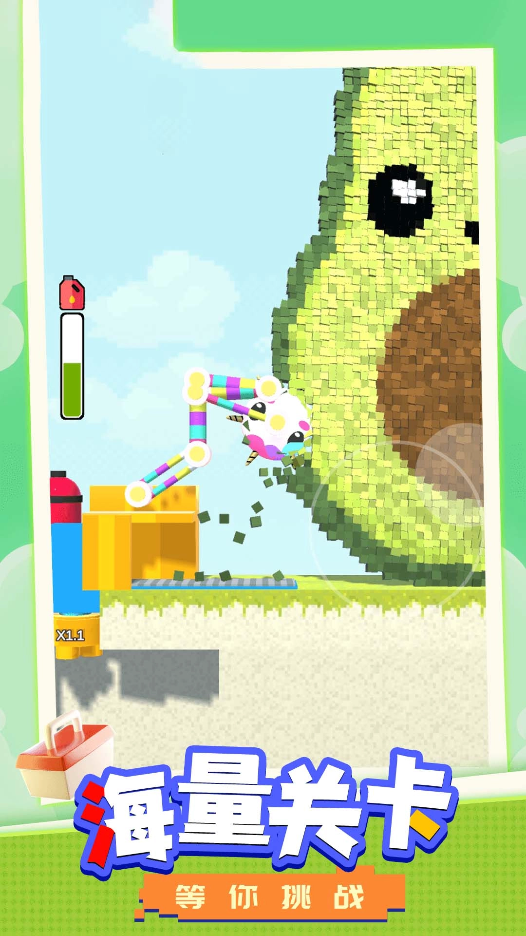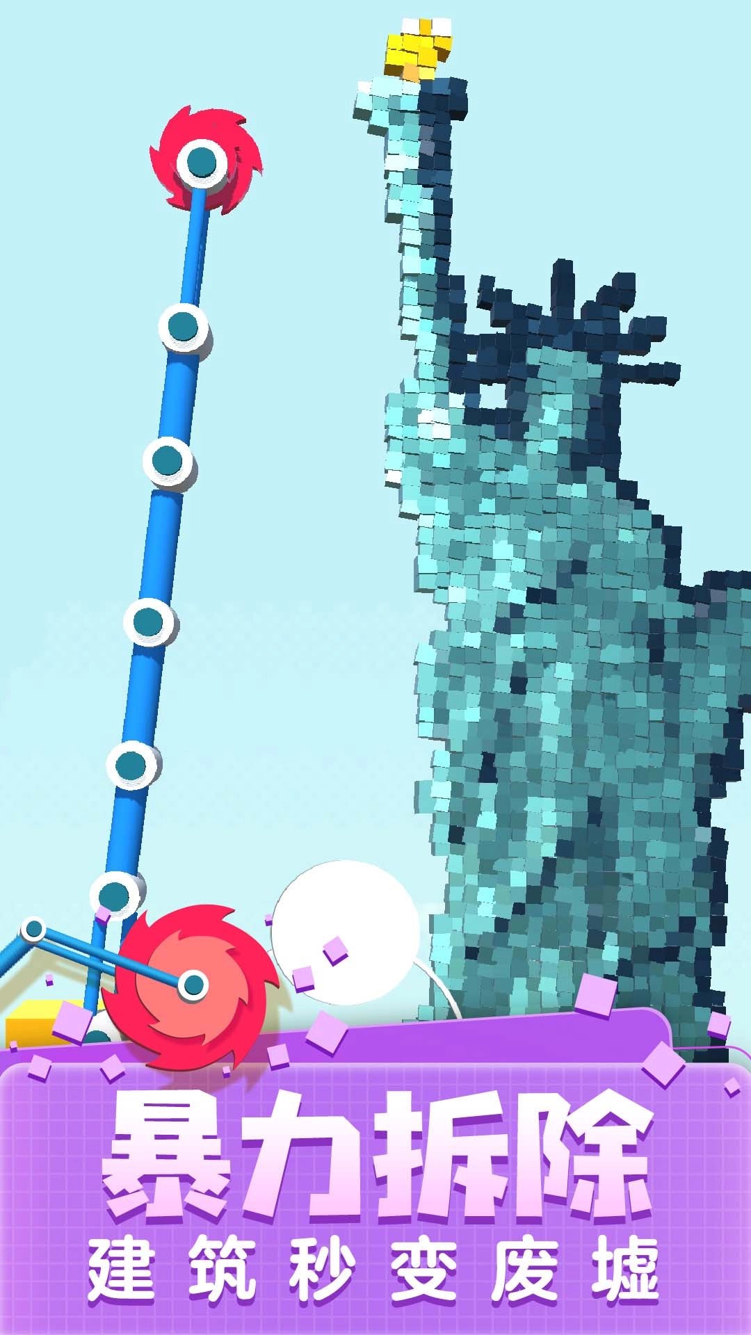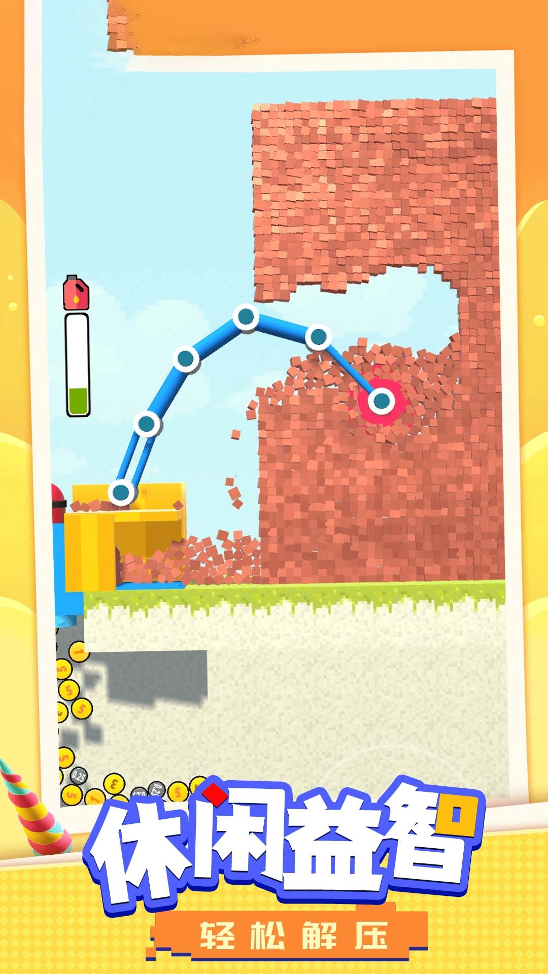 操控挖掘机的机械臂,对准墙体和像素风格的建筑点击进行拆除操作,收集掉落下来的砖块。