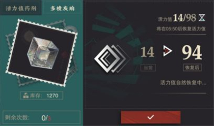 账号等级提升会增加活力的储存上限。当活力未达到储存上限时,每8分钟会自动恢复1点;一旦活力已满,就不再自然恢复(不过使用活力药水或直接购买活力时,活力数值可以超过储存上限)。花费60多棱灰珀能兑换80活力,每天最多可购买三次。此外,零食答礼活动每天会赠送30瓶活力药水。
