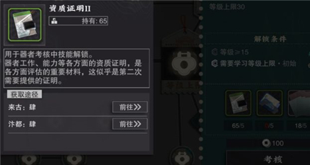 考核所需的资源种类比较多,资质证明属于通用材料,所有角色升级时都会用到它。不同职业要用到对应的核定书和其他材料。要是不清楚材料从哪里获取,可以点击所需材料的图标,这样就能看到材料的获取途径了。