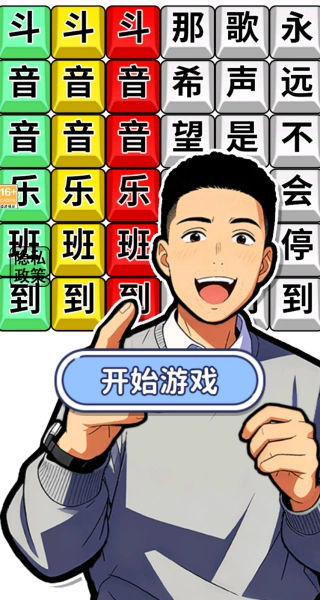 进入游戏后,你可以先浏览界面上的歌词热梗元素,然后点击开始游戏按钮,开启文字解谜挑战。