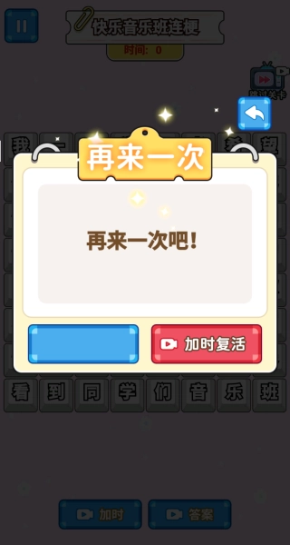 时间到了还没连成梗,挑战没成功,可以选重新来一次试试,或者用加时道具多一点思考时间。