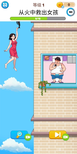 在画面右侧找找看有没有能当绳索用的东西,找到之后把它拖到左边,这样就能帮女孩往楼栋底部降落了。