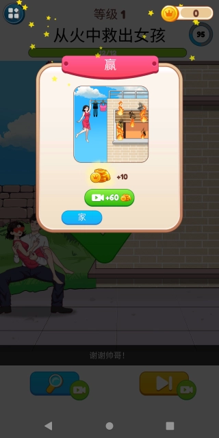 成功解救女孩就能通过这一关。你获得的金币能用来购买道具,这些道具可以在难度高的关卡里帮你顺利通关哦!