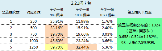 那返场卡组到底合不合适呢?我们不妨看看6月8日那次体能与悍将组合的返场活动——两个卡包的卡池合并,而且1到4阶的卡包都包含五星卡牌,从图中绿、黄、粉三种颜色的分布情况来看,整体概率确实更优。不过重点要关注黑卡部分:这次返场共有6张黑卡,综合出货概率是21.87%,其实并不比当时单独的体能黑布卡包概率高;更关键的是,这6张黑卡肯定有强弱之分,假设以抽黑鸭和黑皮为目标,那概率就只剩7.83%了——这和国家队返场时的情况完全一致:整体出货、出高C卡牌的概率提升了,但瞄准特定目标卡组的概率反而降低,根源就在于卡池规模变大了。所以结论依然是:这类返场更适合需要补充对应位置、且没有明确抽卡目标的新人。