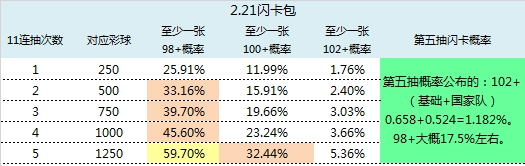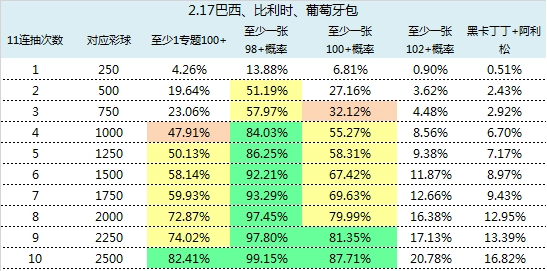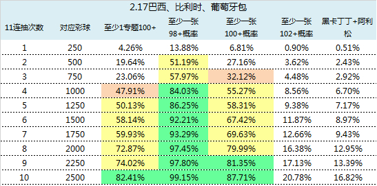 第二点:概率的变化情况究竟怎样?我们可以通过下面几张图来了解。拿2月份推出的巴西、比利时、葡萄牙卡包来说,当时这个卡包中的黑卡只有两张,一轮抽取中获得黑卡的概率大约是16.82%。再对比几个月后(6月份)上线的比利时(第二期)和西班牙卡包,此时一轮抽取包含3张黑卡,整体黑卡概率已经达到32.52%(其中抽到鸭子和拉莫斯的概率为22.87%)。再比如上周推出的阿根廷、比利时(第二期)卡包,黑卡的概率则有了进一步的提升。也就是说,现在的国家队卡包相比年初的时候,黑卡更容易抽到了。而且,高C球员的出现概率也更高了(这是因为国家队进行了更新,高C球员成为了常驻球员)。