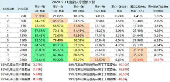 我们来对比一下5月份推出的那款国家队黑卡返场包,当时卡池里包含7张黑卡,而且我记得首次抽取是保底五星球员的。整个卡池抽一轮下来,黑卡的综合出率居然高达42%!不过这些黑卡里质量参差不齐,要是只算范迪克、德布劳内这类当时的顶级卡,实际概率大概只有10%左右,其实并不算高。这很直观地说明,卡池规模扩大后,虽然抽到黑卡的机会变多了,但真正的顶级核心卡(卡皇)并没有因此更容易获得。所以这类国家队返场包,更适合那些卡组各方面都比较落后、急需补充整体战力的新手玩家抽取——毕竟在游戏前期,能多拿到几张黑卡,对提升队伍战力的帮助还是很明显的。
