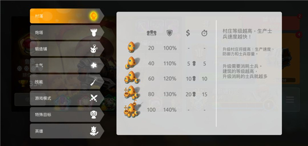 我方占据的每个村庄,都能通过消耗建筑内一定兵力来升级。升级后的【村庄】不仅会提升自身防御力,还会对士兵生产速度和该建筑的士兵容量产生影响!