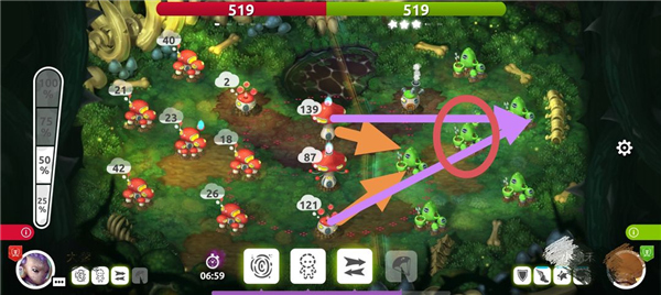 在蘑菇战争里,从A点往B点派兵的常规操作是单手指点击A点后拖动到B点再松开,但实际操作中也能这样:单手指按住A点不放,同时用另一根手指点击B点后松开。开局阶段,要是处于安全状态,还可以从初始点位同时向多个目标点出兵,这样能更快抢占先机,提升发育速度。