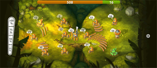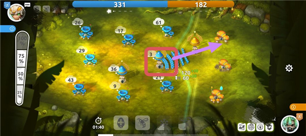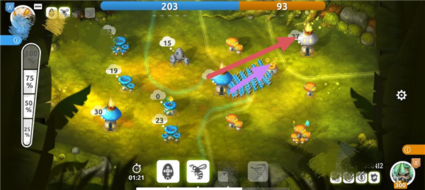 当首领具备一定实力(人(菌)口)后,就能够调兵遣将向周边展开扩张。出征时,可通过调整左侧的百分比进度条,来选择不同建筑中想要派出的士兵数量比例(25%、50%、75%、100%)