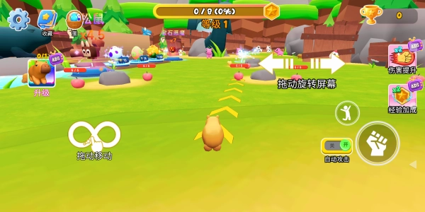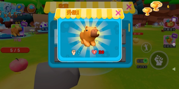 通过左手来操控水豚的移动,点击右侧区域能够开启自动攻击功能,一旦水豚接近目标,便会对目标发起自动攻击。