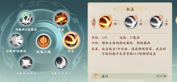 2技能:狂击,对单个目标发起攻击,可临时获得相当于自身等级乘以1.5数值的物理攻击加成。(技能升至2阶时,伤害结果额外提升10%;升至3阶时,伤害结果再额外提升10%)