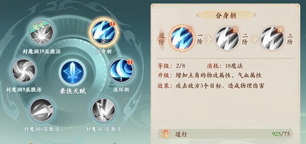 1技能:分身斩,可同时攻击3个目标。(2阶效果:攻击目标数量增加1个;3阶效果:技能造成的伤害结果额外提升10%)